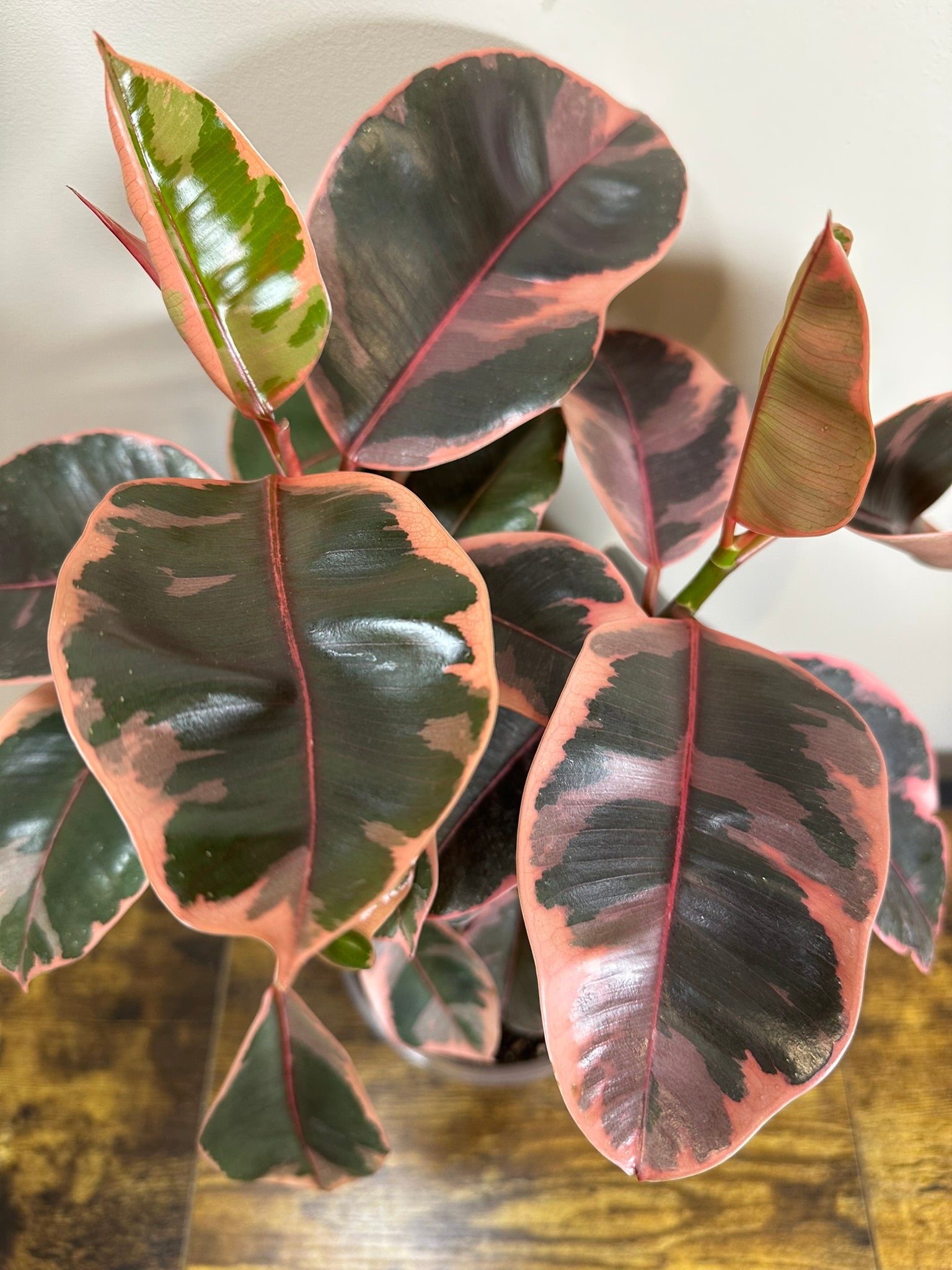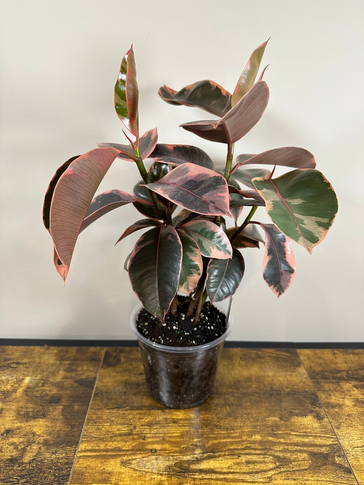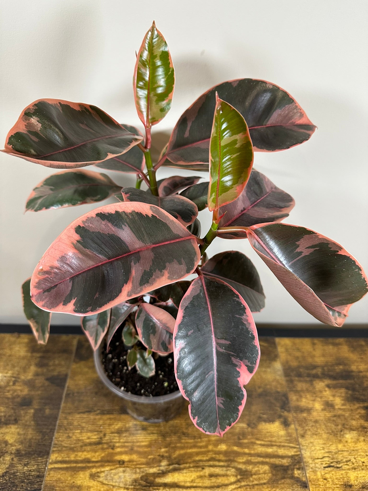 The stunning Ficus Elastica Ruby is a variegated rubber plant adorned with pink and white hues. Its eye-catching pink leaves gradually transform into a lovely mix of white and green as they mature. Known for being low-maintenance, this Ficus flourishes with the right balance of light and water, making it a wonderful addition to any home!