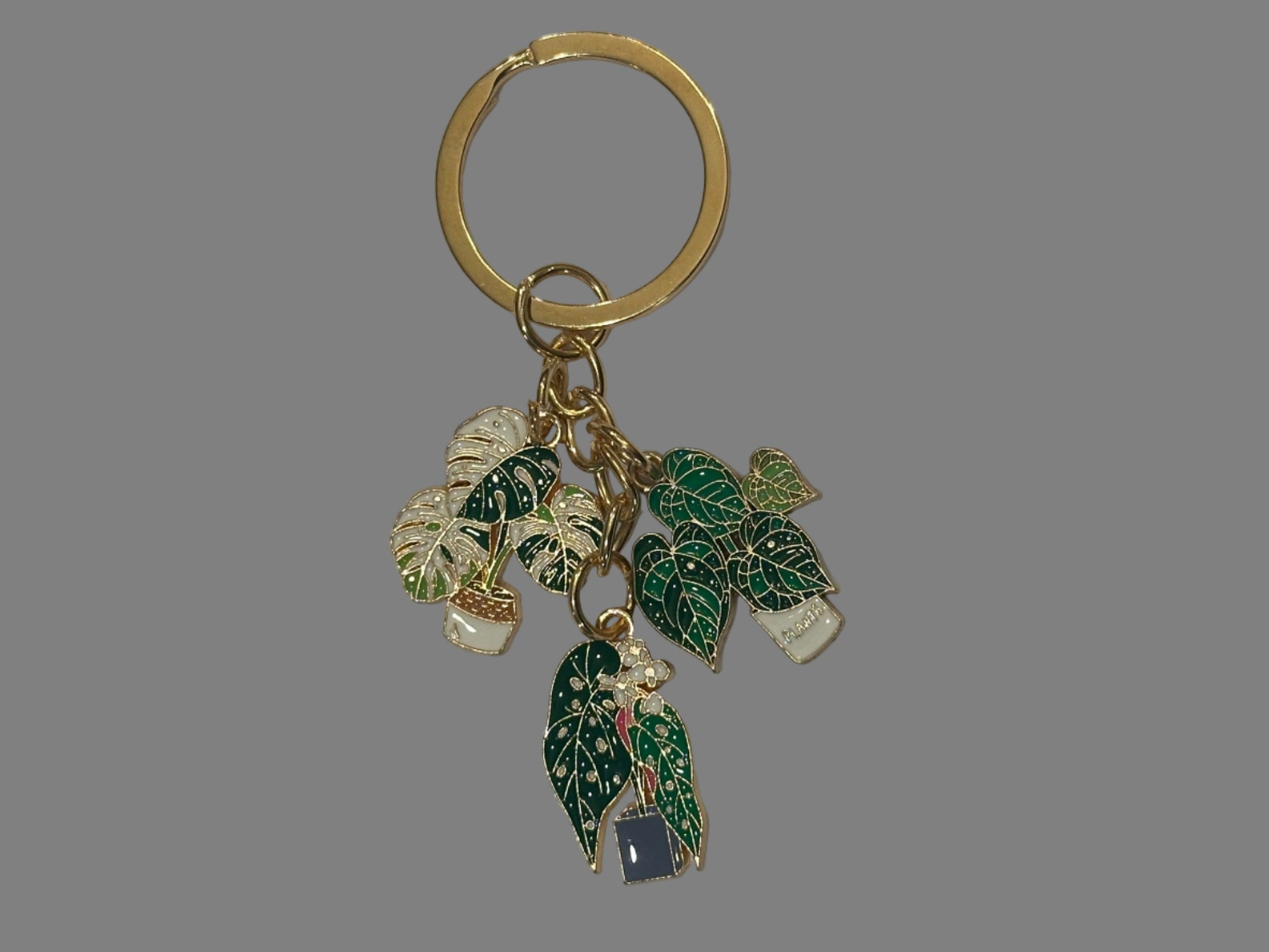 This eye-catching chain features miniature charms of the Albo Monstera, Begonia Maculata, and Alocasia—three beloved houseplants known for their striking foliage and collector status. Whether clipped to your keys, bag, or plant shelf, it’s a wearable celebration of rare beauty and plant obsession.