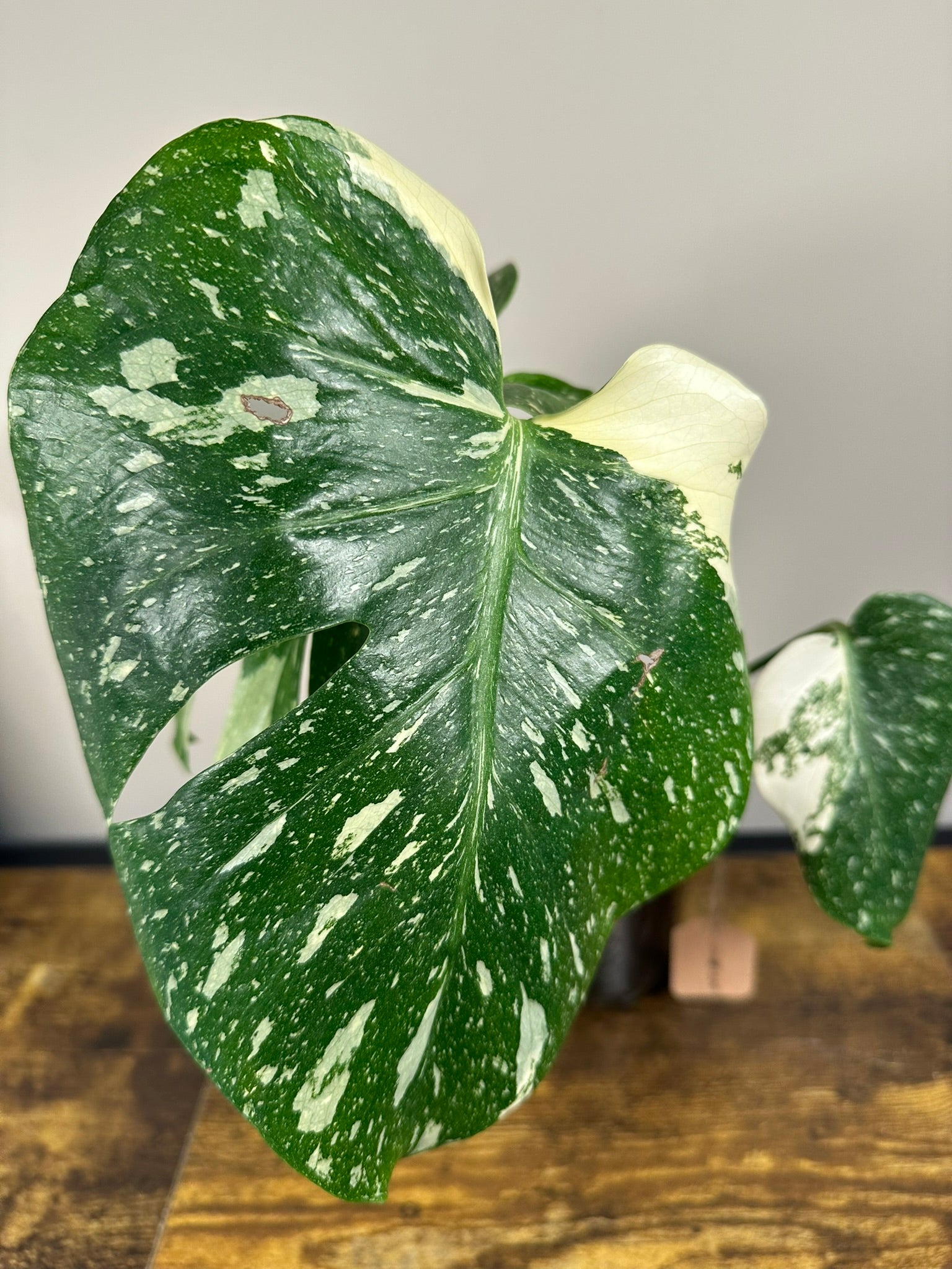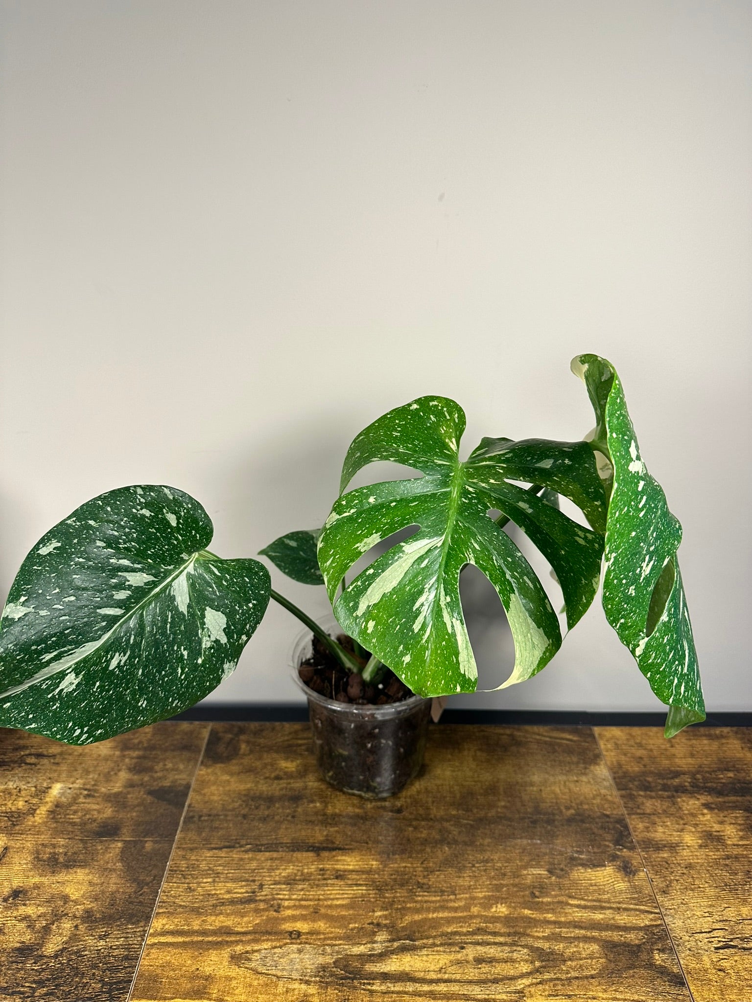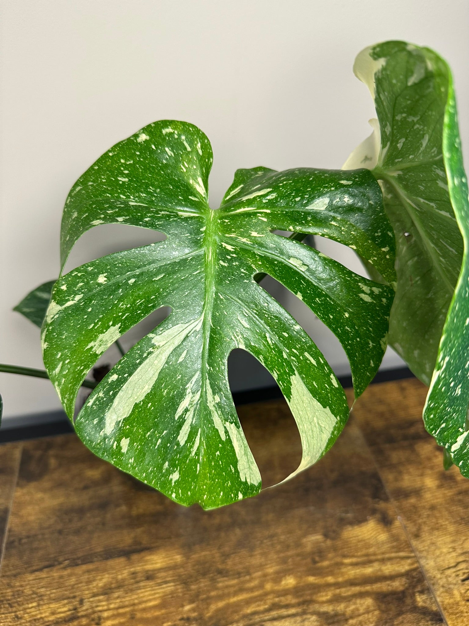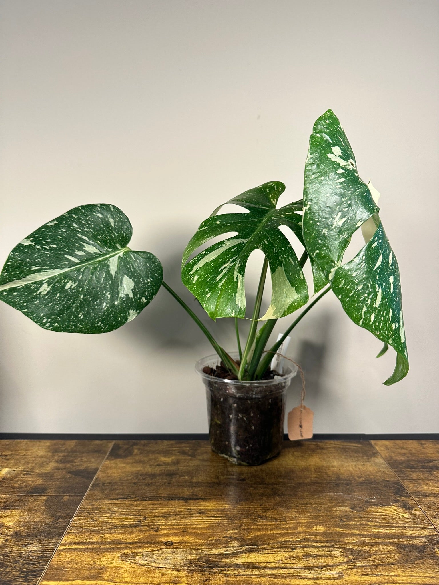 This highly sought-after tropical plant is a true showstopper, boasting large, iconic split leaves adorned with creamy white variegation that resembles a starry night sky. Each leaf features a unique constellation-like pattern, making every Monstera Thai Constellation a one-of-a-kind masterpiece of nature.