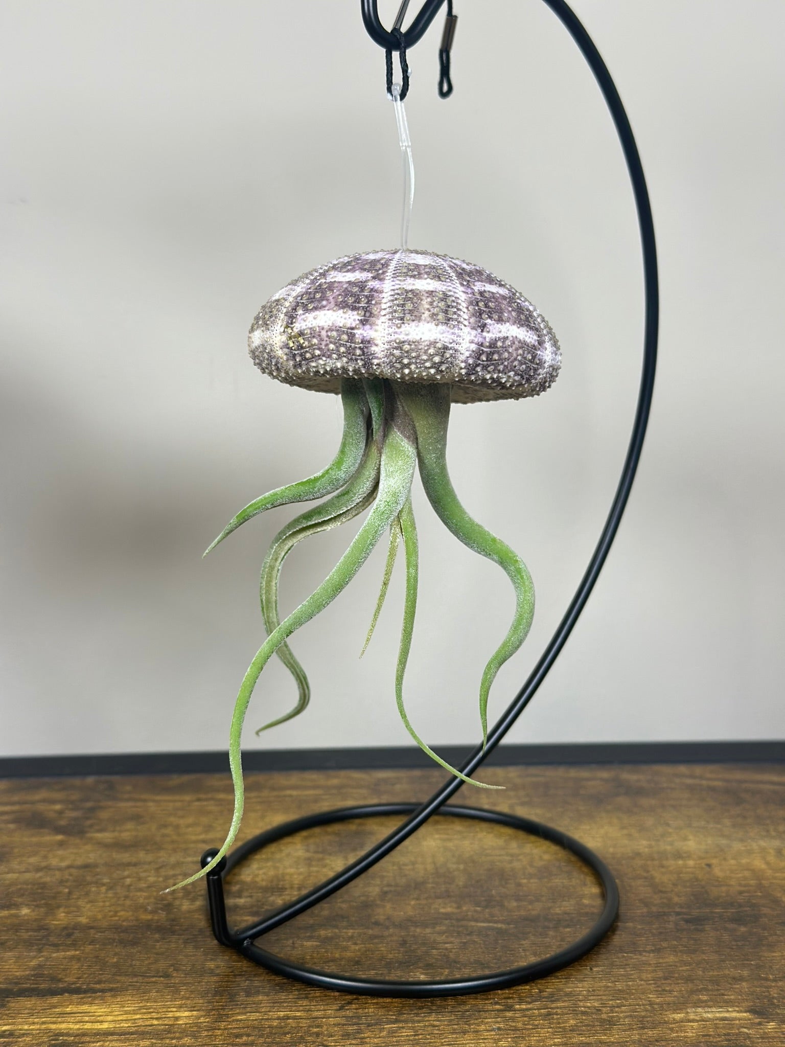 Defy the ordinary with this striking hanging sea urchin shell, featuring a tillandsia that boldly stretches upside down like a rebellious jellyfish. We select larger air plants, measuring 4 to 7 inches, to amplify this daring design. The sea urchin shells, between 3 and 4 inches wide, are forged from resilient calcium carbonate, ensuring a durable and commanding statement piece. Purchase this masterpiece with or without the 9-inch-tall display hanger.