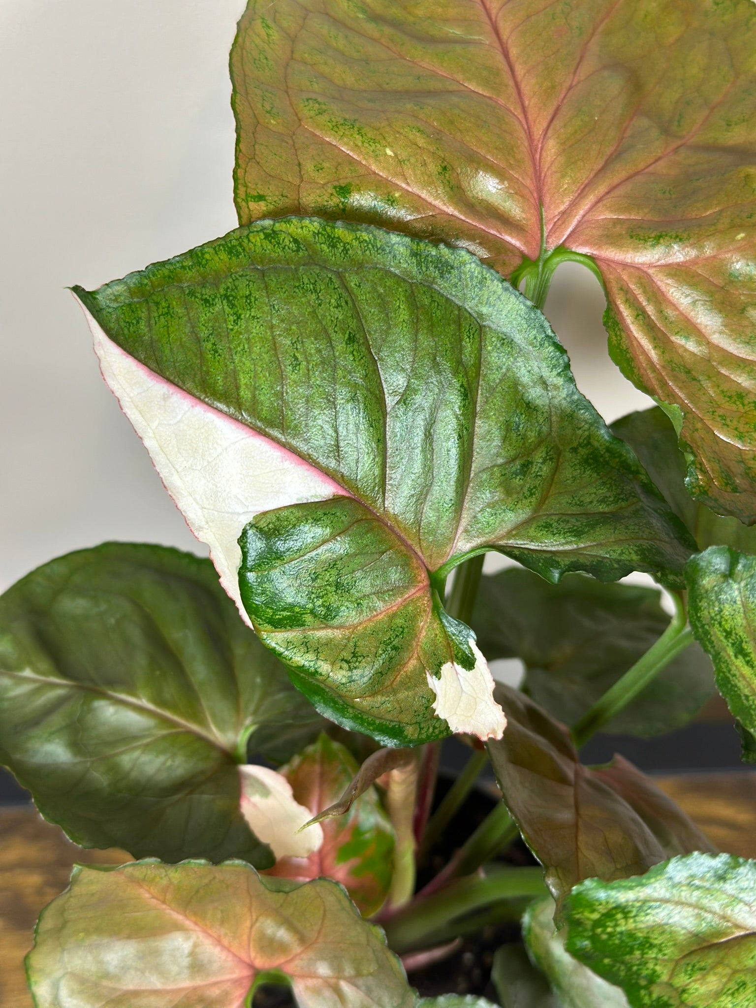 A rare treat for plant lovers, the Strawberry Ice Syngonium is a tropical stunner with arrow-shaped leaves kissed by shades of blush pink, creamy white, and lush green. Each leaf is a one-of-a-kind masterpiece.