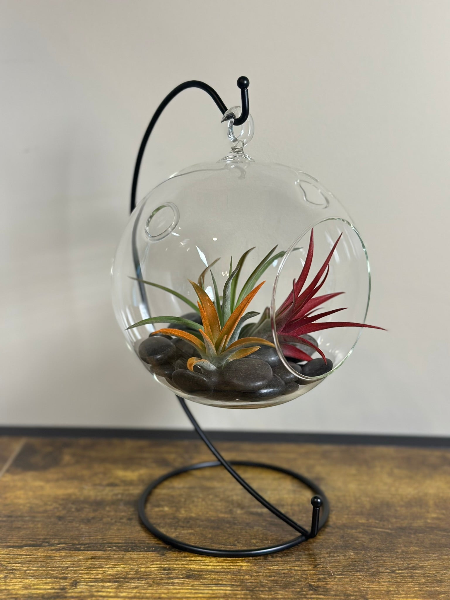 Adorable, whimsical, and oh-so-stylish, this air plant hanging terrarium is a perfect addition to any space. Suspended in a sleek glass globe, the vibrant air plants create a miniature world of natural beauty. Nestled on a sleek, 9" black hanger, it's a conversation starter and a piece of living art. This 5" round, glass terrarium arrives in component form, requiring assembly to achieve its finished state. The disassembled packaging ensures optimal shipping efficiency and safety while allowing you complete control over the final installation and presentation of your display.